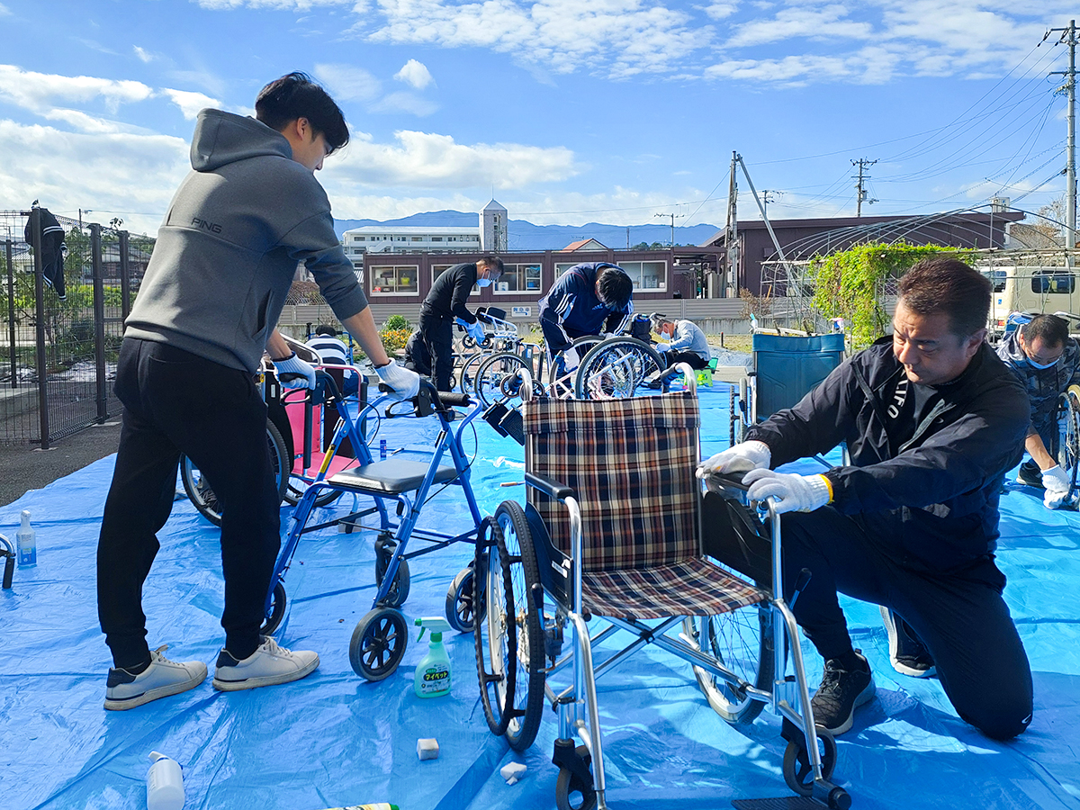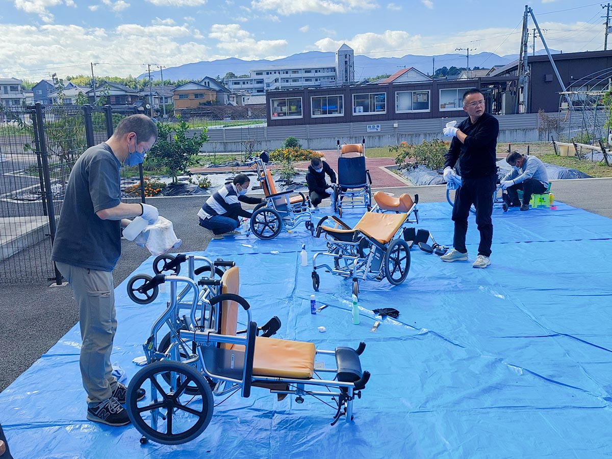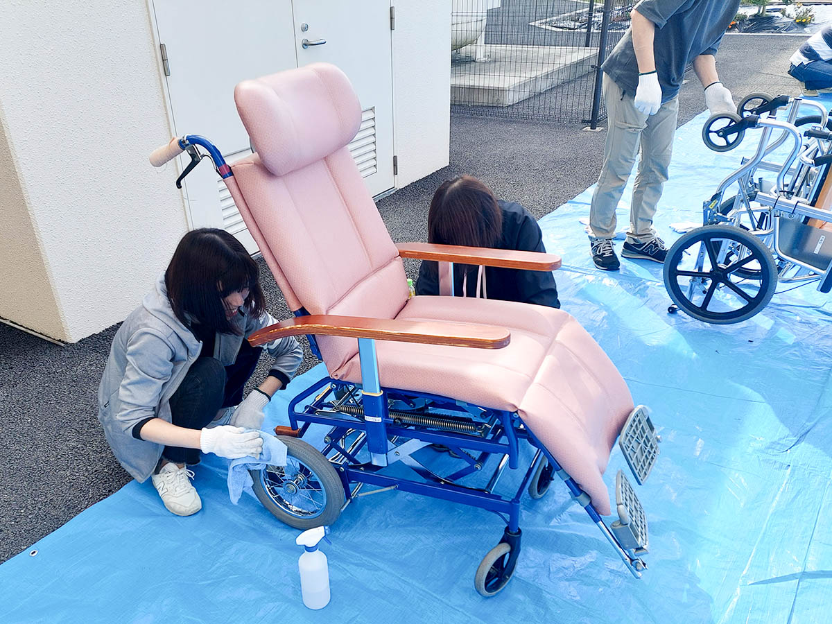 大神子病院で実際に使用されている車いすの清掃を行いました。